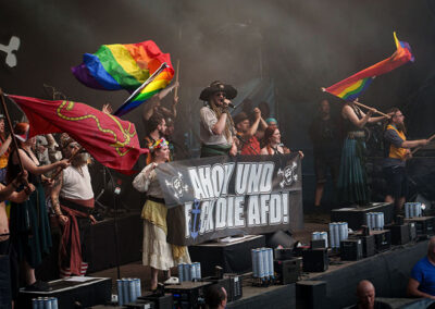 Der erste Headliner des Tages: Mr. Hurley und die Pulveraffen – unsere Lieblingspiratenband aus dem karibischen Osnabrück. Wer die Band kennt, weiß: Hier ist Spaß vorprogrammiert. Neben den üblichen Bangern gab es mit Piraten: Mega Geil auch die erste Single vom kommenden Album. Wie immer bei den Pulveraffen gehörte auch eine klare politische Haltung zur Show: Mit einem lauten „Ahoi und fickt die AfD“ positionierten sich Band und Publikum beim Song Haifisch 2024 deutlich gegen Rechtsextremismus. Die Show war absolut mitreißend und vermutlich die beste Party des ganzen Festivals. Mit dem Klassiker Blau wie das Meer entließen uns unsere Lieblingspiraten in die letzte Umbaupause vor dem letzten Act auf dem Tunierplatz.