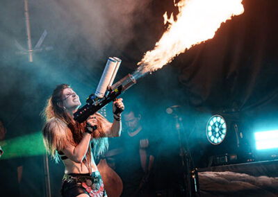 Für mich begann der Tag mit der zweiten Band im Tagesprogramm: Den Gossenpoeten. Mit feuchtfröhlichem Trinker-Folk brachten die Franken die versammelten Feuertänzer in Wallung und verstanden es wirklich gut, das Publikum zu unterhalten. Sogar ein Special Guest wurde geboten: Metal-YouTuber DARKSIFFLER, der sich beim Song Konterbier aus einem auf der Bühne aufgebauten Zelt schälte und eben jenes besungene Konterbier frisch gezapft im Publikum verteilte.