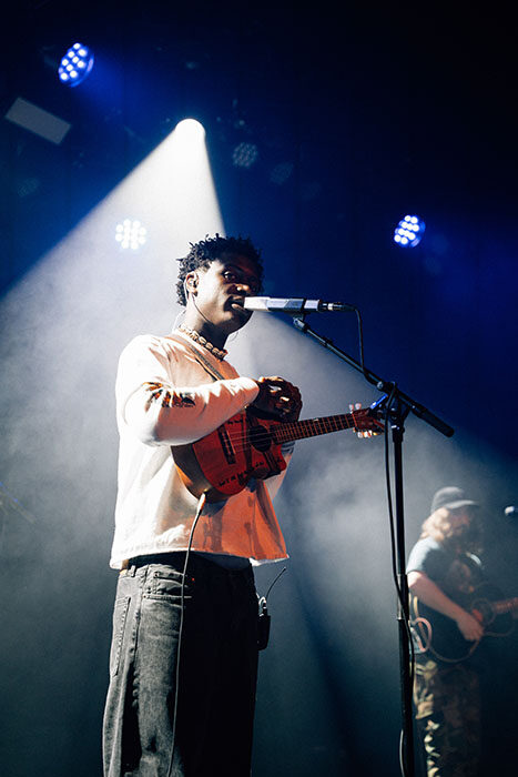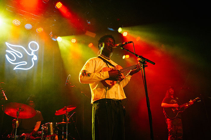 Als Mon Rovîa schließlich um 21:00 Uhr die Bühne betrat, war der Raum bereits geöffnet. Seine Stimme, rau und warm zugleich, legte sich über das Technikum wie ein ruhiger, aber bestimmter Strom. Im Gepäck hatte er auch seine Band dabei, die aus verschiedenen Städten der USA kommen, u.a. Chicago oder Los Angeles. Er selbst, ursprünglich in Liberia geboren, hat zudem bei der Vorstellung seiner Band auch eine kleine Anekdote am heutigen Konzert erzählt, denn sein Gitarrist, der ihn seit seinen Anfängen begleitet und er selbst, stehen gemeinsam and diesem Abend zum 100. Mal zusammen auf der Bühne. Zwischen Americana, Folk, Indie und einer fast spirituellen Intimität erzählte er Geschichten von Identität, innerem Ringen und Hoffnung, ohne Pathos, ohne Schutzschild. Besonders in den reduzierten Momenten, wenn Gitarre und Stimme genügten, entstand eine spürbare Nähe, die den ganzen Raum erfasste. Mon Rovîa suchte keine große Inszenierung, sondern Verbindung, und fand sie in einem Publikum, das aufmerksam, respektvoll und fast andächtig reagierte. Hier und da auch lautes Mitsingen, kein aufgesetzter Jubel – vielmehr diese seltene, dichte Stille zwischen den Songs, die zeigt, dass Musik gerade wirklich ankommt. Am Ende blieb kein Gefühl von Euphorie, sondern eines von Tiefe. Ein Konzert, das nicht laut verabschiedet, sondern lange nachwirkt, irgendwo zwischen Herz und Kopf. Gegen 22:30 Uhr war das komplette Set am Ende angelangt.
