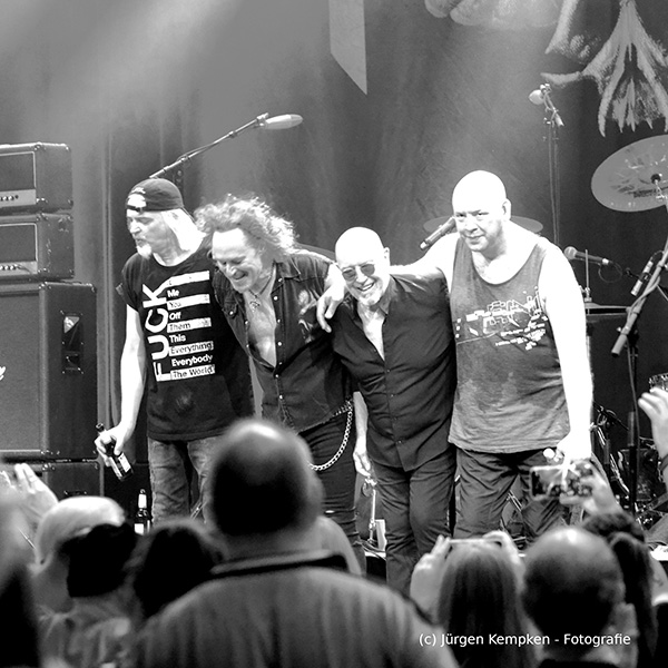 Am 29. April war eine schottische Hard-Rock-Band zu Gast, die zurecht, neben großen Namen wie Led Zeppelin, Deep Purple, Black Sabbath und anderen, zu den Mitbegründern der Hardrock-Scene zählen NAZARETH. Allesamt legten die Grundsteine für den späteren Heavy Metal. Für die Mensch mit großem Erfahrungshintergrund (um nicht zu schreiben den Ältern) wird sich als erstes der Hit Love Hurts zu dem Namen der Band einfallen. Ich war überraschten, dass auch jüngeren der Song, weniger allerdings die Band bekannt war. Zeugt zumindest für eine Nachhaltigkeit der musikalischen Darbietung. Von der 1968 gegründeten Band ist allein der Bassist Pete Agnew noch unter den Lebenden. Jimmy Murrison (guitar) ist seit 1994 dabei, Lee Agnew (dums) seit 1999 und Carl Sentance (vokals) seit 2015. Besonders tragisch für den letzten Gründer der Band Pete Agnew, war der Tod seines Freundes und ehemaligen Sängers der Gruppe Dan McCafferty, der am 8. November 2022 verstarb.