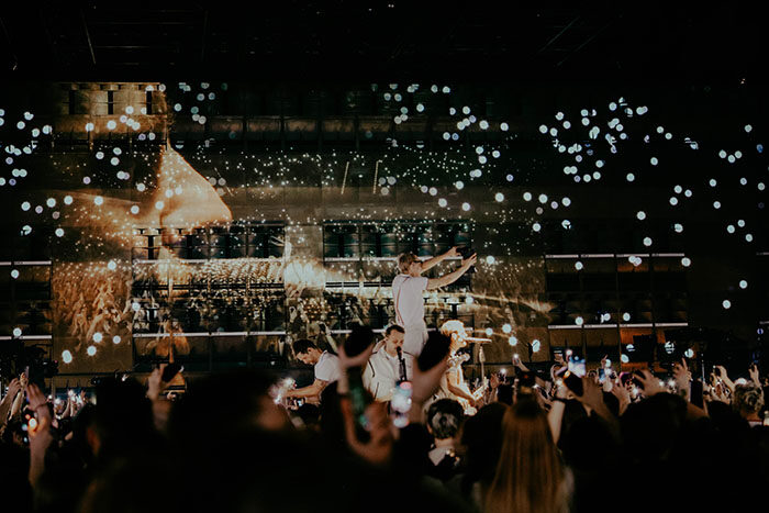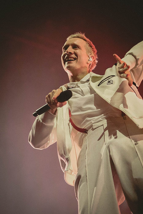 Vor ausverkauftem Haus und rund 10.000 Besuchern gab es dann kein Halten mehr, als Kraftklub die Bühne betraten. Bereits beim ersten Song verwandelte ein regelrechter Konfetti-Tornado die Halle in ein tobendes Chaos. Die Band präsentierte sich stimmlich in Topform – live sogar noch stärker als auf Platte. Dabei beschränkten sie sich nicht nur auf die Bühne: Immer wieder tauchten sie mitten im Publikum oder in den Rängen auf und nutzten die gesamte Arena, was der Show eine besondere Nähe und Intensität verlieh. Was Kraftklub live zusätzlich ausmacht: Die Nähe zum Publikum. Hier wird nicht einfach nur runtergespielt – die Band interagiert, nimmt die Leute mit und sorgt dafür, dass sich das Ganze wie ein gemeinsames Erlebnis anfühlt. Genau das macht solche Abende besonders.