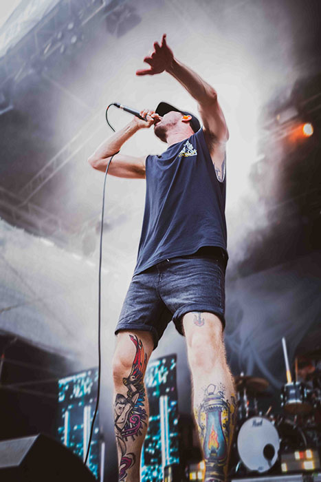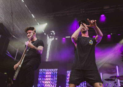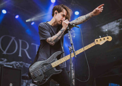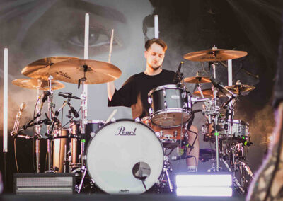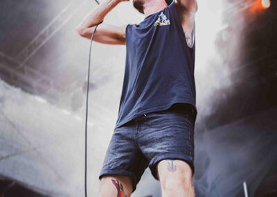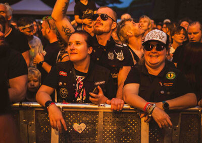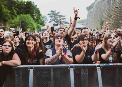 Trotz bewölkter und regnerischer Prognosen hielt das Wetter glücklicherweise stand. Wobei, wenn ich mich an letztes Jahr erinnere, dann konnte auch Regen die Energie des Open-Airs nicht wirklich bremsen. Als Fotograf bot das Festungsambiente ganz besondere Kulissen — altes Gemäuer und hohe Zinnen, geschmückt von bunten Rock- und Punkfans. Schon ein eigensinniges Bild! Ein besonderer Moment war, als Rudi Schwarzer – der Sänger von Annisokay – über die Absperrung des Fotograbens kletterte und dem Publikum ganz nahe kam.