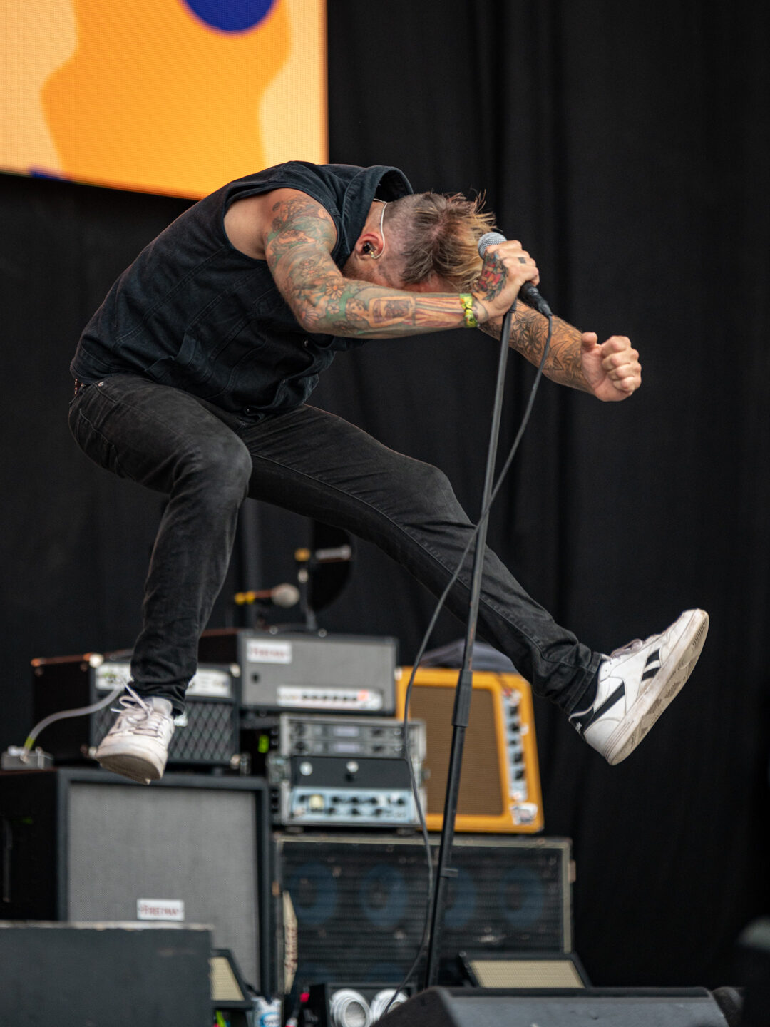Das absolute Highlight des Tages lieferten die Donots auf der Main Stage. Die Punkrocker aus Ibbenbüren sorgten nicht nur für einen riesigen Circle Pit sondern auch für klare politische Statements. Sänger Ingo Knollmann ludt kurzerhand die Masse an Fotografierenden auf die Bühne ein, damit die Band freie Sicht auf die Fans hat! Dort gab es nämlich einiges zu sehen: Eine Frau aus dem Publikum übernahm den Lead im Circle Pit und heizte die Menge richtig an. Politisch wurde es bei „Kein Bock auf Nazis“. Knollmann machte deutlich, dass Nazis hier nichts zu suchen haben und drohte klare Konsequenzen an. Richtig und wichtig.