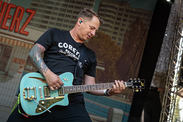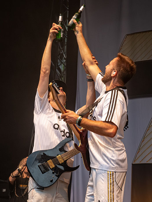Unser letzter Festivaltag begann auf der Sounds for Nature Stage mit 100 Kilo Herz. Die Jungs präsentierten sich erneut als absolut verlässliche Live-Bank. Energiegeladen, sympathisch und mit viel Spielfreude. Bereits am Morgen hatten sie ein Akustik-Set auf der Campingplatz-Stage Festival Village gespielt, doch jetzt wurde richtig losgelegt, inklusive reichlich Pyro-Einlagen aus dem Publikum.