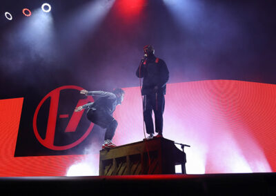 Twenty One Pilots bestehend aus Tyler Joseph (Frontmann) und Joshua Dun (Drummer) hatten wirklich alles im Angebot was man sich vorstellen konnte! Musikalisch hatten sie eine gute Auswahl aus fünf ihrer Alben (Clancy, Fessel, Blurryface, Scaled And Ice, Trench) im Gepäck, sowie Singles wie „Heathens“ deren Song viele mit dem Film Suicide Squad in Verbindung bringen. Neben ganz viel Action auf der Bühne – im Sinne von Pyro, Lasern, Feuer, Konfetti, Bühnenwechseln und perfekt abgestimmten Videos zu den Songs, lag Tyler Joseph und Joshua Dun viel daran ihren Fans nahe zu sein. Vor allem Frontmann Tyler Joseph war kaum mit den Augen einzufangen, denn entweder war er auf der Bühne oder mit nur einem Atemzug im Publikum. Besonders ein Moment zum Song „Car Radio“ wird dem ein oder anderm Besucher hängen bleiben, denn als die letzen Zeilen des Songs begannen verließ Tyler Joseph die Bühne über eine Treppe und erschien wenige Sekunden später in einem Lichtkegel einige Meter entfernt inmitten der Menschenmenge der oberen Ränge. Ob er einen Doppelgänger hat, zaubern kann oder einfach nur eine sehr gute Kondition hat wurde an diesem Abend leider nicht geklärt.